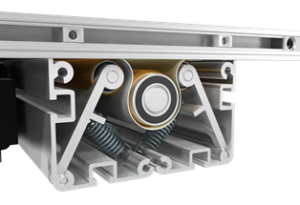 The purpose of the pinch drive is to force the conveyor belt against the drive roller, giving it driving traction without the use of tension. Conveyors have two pinch drive mechanisms, each spring loaded against the drive roller. This design allows the belt to be run in either direction and only requires enough belt tension to lay the conveyor belt flat. Since over-tensioning the belt is not required, the belt lays flatter, which is needed for lightweight components.