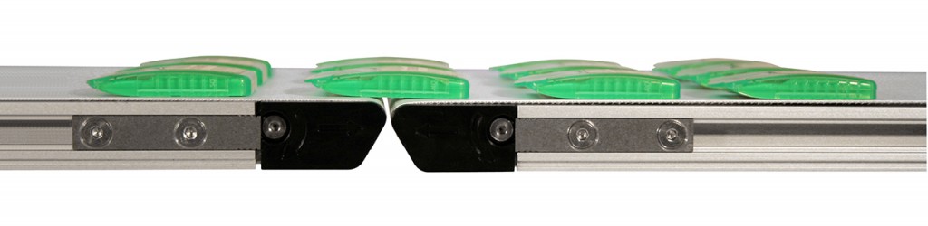 To build a miniature conveyor, end rollers have been reduced to 5/8”. This profile enables it to fit into tight spaces within a machine, but also when positioned together end-to-end, can successful transfer products as small as 7/8” in diameter. The bearing housings are fully encapsulated within the conveyor frame. The advantage this affords an end user is that two conveyors can be positioned side-by-side and be nearly flush with one another with only a 1/4” gap from belt edge to belt edge.